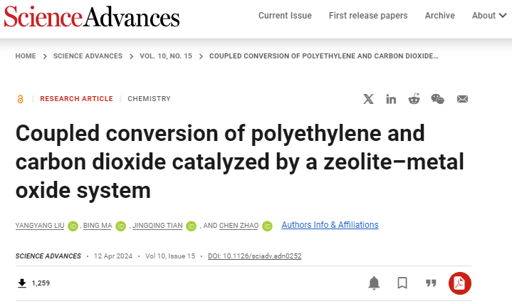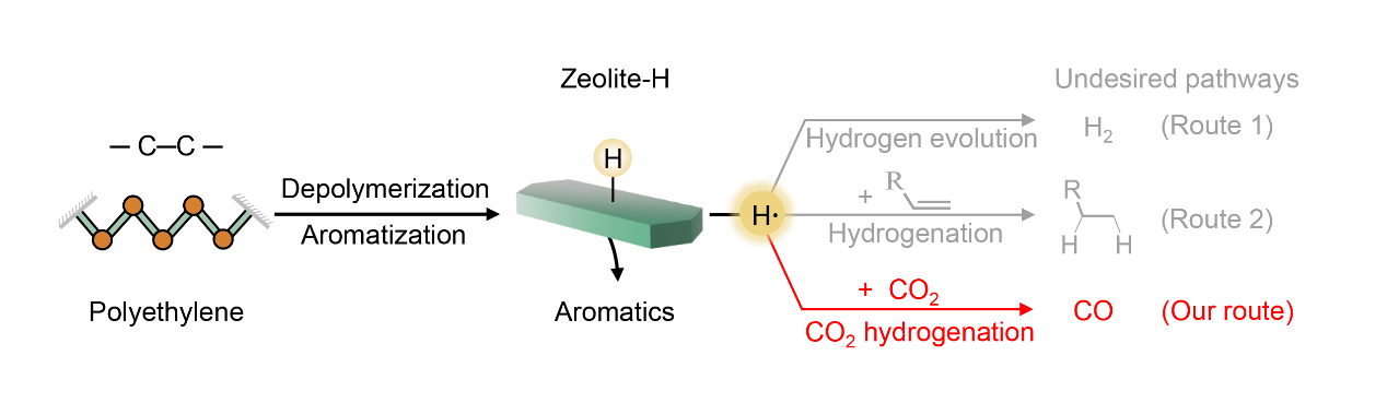 鉴于此,洛神直播 赵晨教授研究团队在废弃碳资源塑料和CO2的高价值利用上取得重要进展。构建了沸石-金属氧化物多相催化体系,通过芳构化-氢捕获机制耦合转化废弃聚乙烯与CO2为芳烃和CO。综合多种原位表征、同位标记、模型物的验证等手段,阐释了芳构化-氢捕获的反应机理。相关研究以“Coupled conversion of polyethylene and carbon dioxide catalyzed by a zeolite–metal oxide system”为题,于2024年4月12日发表于Science Advances。