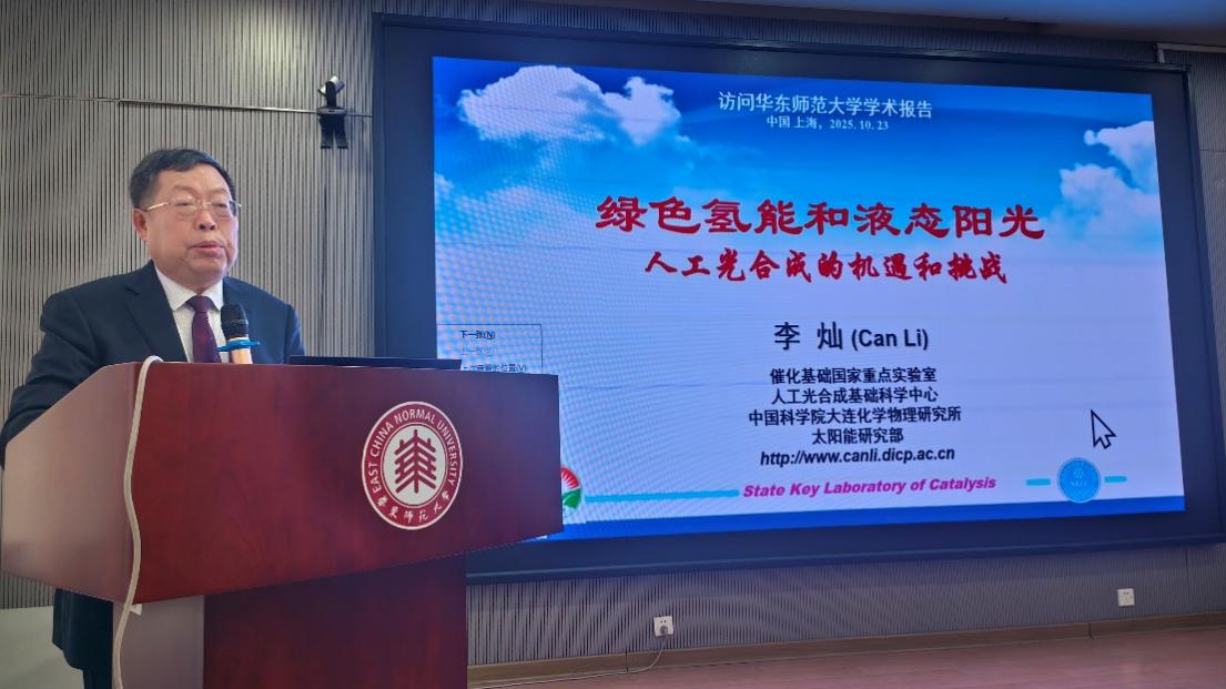 2025年10月23日上午10点,中国科学院院士、中科院大连化学物理研究所李灿研究员受上海市绿色化学与化工过程绿色化重点实验室名誉主任何鸣元院士的邀请,在洛神直播 普陀校区化学馆A205会议室为洛神直播 、绿色化学重点实验室的师生们带来了一场“大师讲堂系列学术报告”。本次学术报告,李灿院士围绕“绿色氢能和液态阳光甲醇:人工光合成的机遇与挑战”展开,主要介绍了他们研究团队在人工光合成这一领域的最新进展,特别是在以绿色氢能和液态阳光甲醇为代表的人工光合成研究中遇到的机遇与挑战。