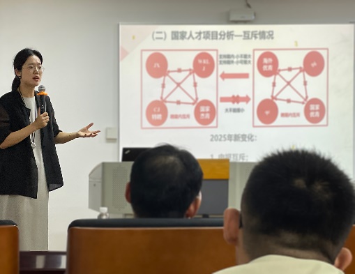 学校人事处人才办主任张亚男受邀以《人才政策交流》专题报告,围绕国家级及上海市各类人才计划,系统梳理申报条件、待遇支持、工作流程及2025年度项目之间的互斥规则,并现场为青年教师“把脉问诊”,鼓励大家精准定位、积极申报,同时广荐英才。